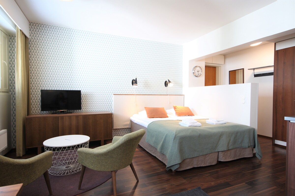Homelike hotel room with great amenities at Hiisi Hotel Helsinki Jätkäsaari. The experience is contactless and the arrival easy with a door code. The room featuring 2 single beds and a chairbed is suitable for up to 3 persons. Work desk and chair and an ensuite bathroom, a flat-screen TV and WiFi. All rooms feature a mini fridge for your snakcs. Linen, towels and final cleaning are included. No breakfast or reception. Shared kitchen and laundry available.