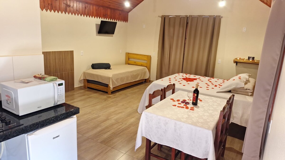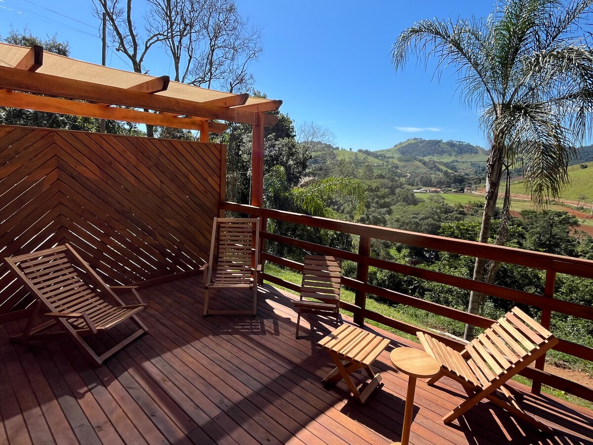 Sealla adhmaid, tumtha i nádúr Serra da Mantiqueira, ar theorainn Extrema/ Toledo MG. Foirfe dóibh siúd ar mian leo éalú ón gcathair mhór agus ceangal a dhéanamh leo féin, le daoine eile agus leis an dúlra, le go leor príobháideachta. Tógtha ag baint úsáid as teicnící inbhuanaithe agus ag urramú an dúlra - ní úsáidimid nimheanna anseo! Tá roinnt easanna, turais agus bialanna sa cheantar - féach ar ár lámhleabhar aíonna agus tú ag déanamh áirithinte! Áit speisialta le haghaidh deireadh seachtaine rómánsúil nó scíthe.