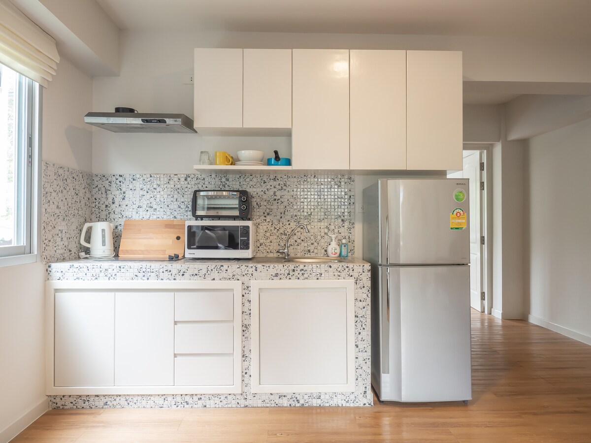 Bain sult as draíocht nua - aimseartha an tseomra deas maisithe seo. Tá sé troscánaithe go hiomlán agus tá na fearais leictreacha go léir ann a chuireann le compord d'fhanachta! Beidh an áit go léir agat féin [seomra leapa, seomra folctha, cistin agus spás suí] Tocht Rí ar mhéid caighdeánach agus foireann braillíní Muji atá bog agus compordach. Wi-Fi saor in aisce, Teilifíseán Cliste 60" + is féidir leat féachaint ar do Netflix féin, Íontóir aeir, meaisín níocháin le feidhm triomaithe, iarann, oigheann micreathonnach, cuisneoir, sorn leictreach agus uirlisí cócaireachta. Seomra folctha le cithfholcadán báistí agus meaisín uisce the.