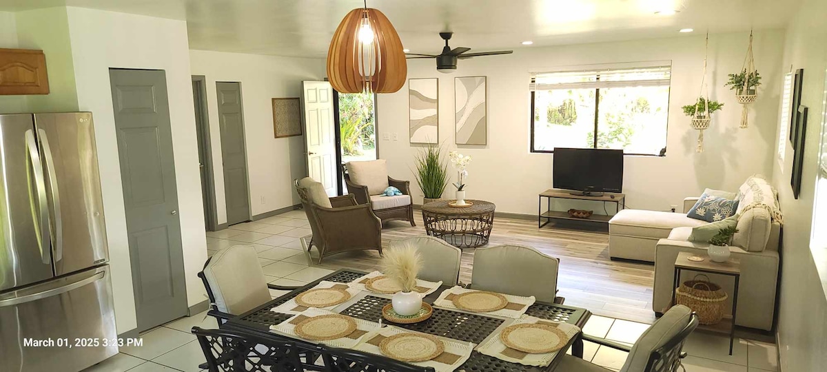 Agus é timpeallaithe ag magairlíní agus bláthanna trópaiceacha eile, tá an teachín suite ar dhá acra álainn tírdhreachtaithe - 30 nóiméad ó Hilo nó i bPáirc Náisiúnta Bolcáin Haváí. Tá an réadmhaoin faoi thiomáint na gréine, córas inbhuanaithe lasmuigh den eangach le seirbhís fóin 4G agus Wi - Fi snáthoptaice. Tá an dá mhíle dheireanacha ar bhóthar gairbhéil neamhphábháilte i riocht athraitheach ag brath ar an méid báistí a bhí againn le déanaí. Ní gá tiomáint ceithre roth a thiomáint ach moltar SUV nó feithicil chomhchosúil le himréiteach níos airde.