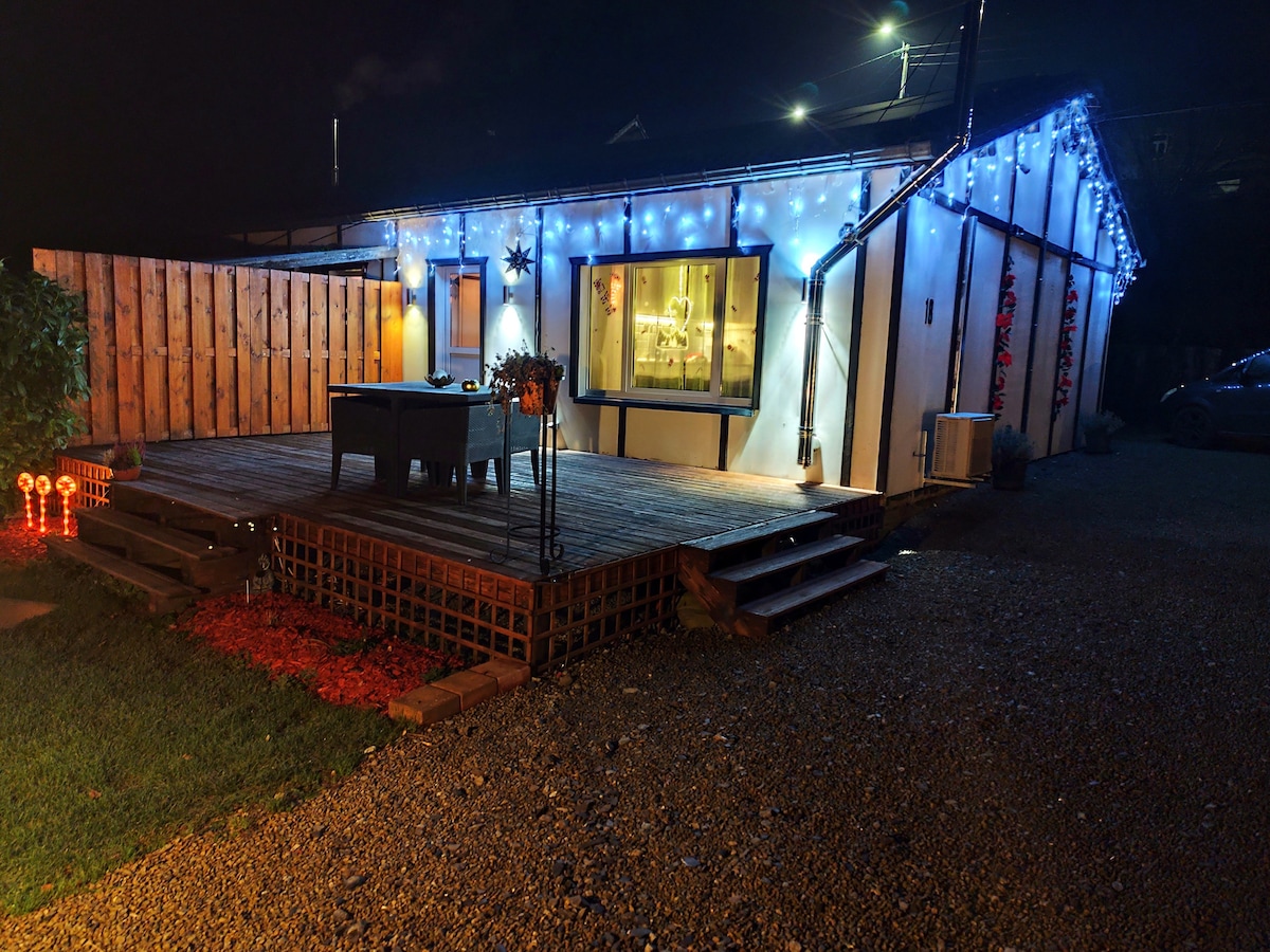 Is é an nead grá ár n - tearmann faoin tuath. Teach beag adhmaid comhaimseartha, ina bhfuil teallach mór cloiche, tá seomra dúbailte álainn agus seomra níos lú in aice láimhe ar fáil atá scartha ón seomra suí le cuirtín. Téite go hiomlán ag sorn dóite adhmaid agus tine oscailte, cuireann sé atmaisféar te agus mealltach ar fáil. Tá ardán a bhfuil aghaidh an deiscirt air, atá clúdaithe go páirteach (oibleagáidí na Beilge), a bhfuil sé ar fad clúdaithe ann.