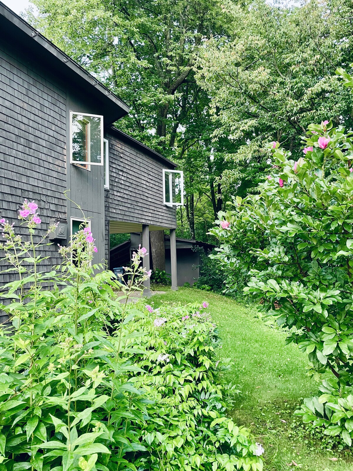 Begin your Vermont experience at our serenely secluded, wooded hide–a-way. This inviting private home features all the best amenities including luxury linens, fully equipped kitchen, bath with custom over sized shower, a beautiful deck with gas grill, teak and glass dining table, and lounge seating for 4. It is the perfect space for 2 adults and children, or up to 4 adults, providing easy access to the best Vermont has to offer from Lake Champlain, Vergennes, Middlebury, and all points beyond.
