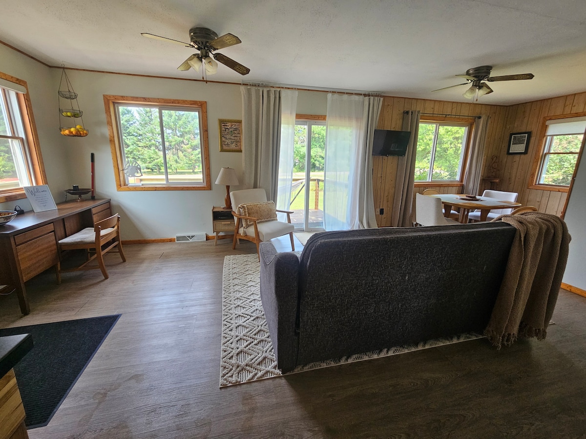 Is é an teachín cluthar nuashonraithe aon seomra leapa atá againn in Northwestern Wisconsin an áit fhoirfe chun tús a chur le d'eachtraí in Northwoods. Tá sé suite an-ghar do roinnt lochanna agus aibhneacha atá iontach don bháid, don chadhcáil agus don iascaireacht. Tá an teach laistigh de chúpla míle ó roinnt mórbhealaí a threoraíonn chuig na heachtraí go léir atá le tairgeadh in iarthuaisceart Wisconsin.