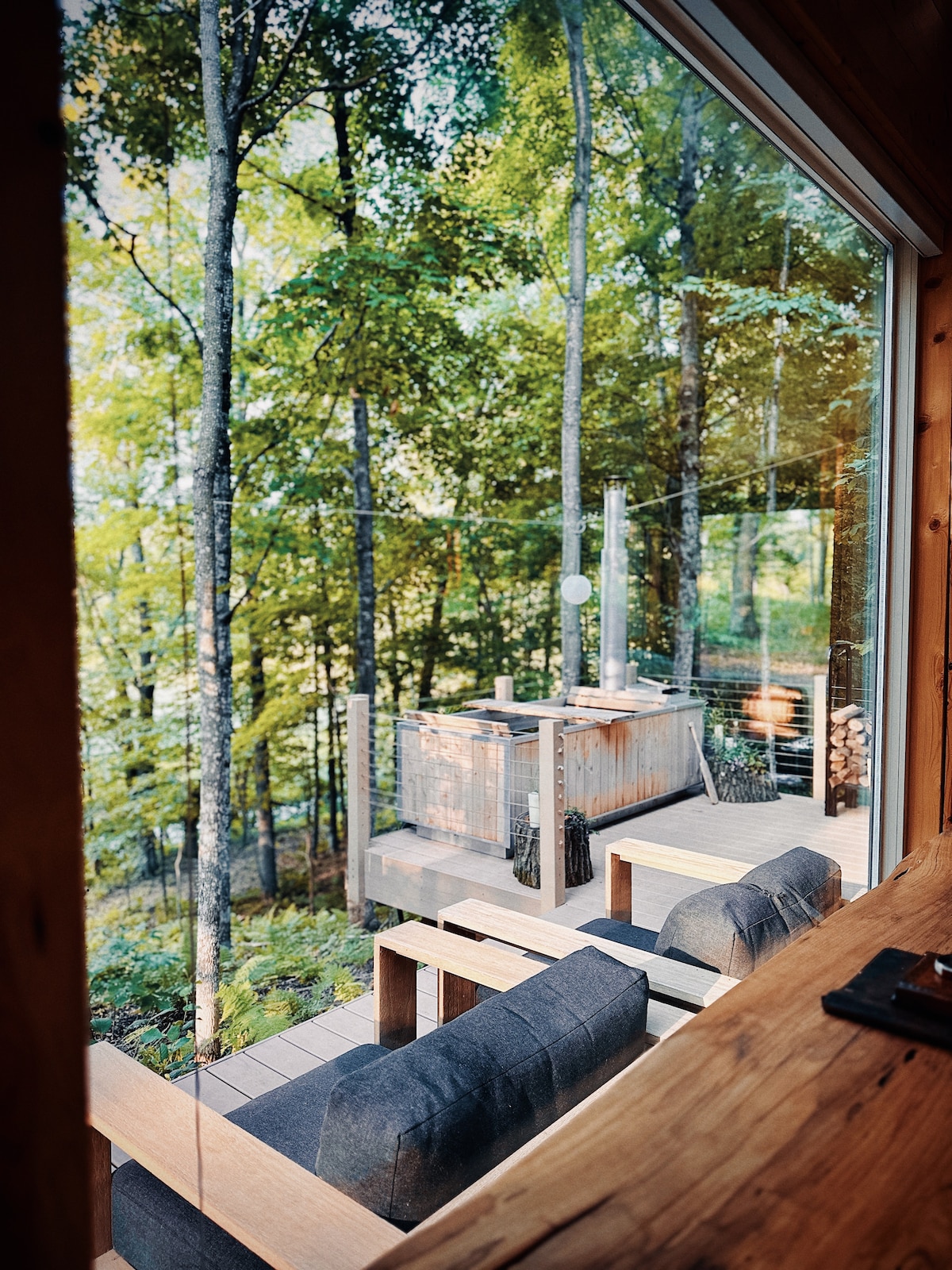 Éalaigh go dtí an cábán álainn seo atá neadaithe sa choill ar loch suaimhneach. Lena leagan amach cluthar agus a fhuinneoga móra, beidh tú ar do shuaimhneas agus áilleacht an dúlra thart air. Bain sult as radhairc iontacha ar an spéir dhorcha san oíche agus múscail fuaimeanna síochánta na Foraoise Náisiúnta. Déan iniúchadh ar eachtraí gan deireadh le fánaíocht, ATV, agus cosáin shneachta nach bhfuil ach céimeanna ar shiúl. Scaoil ar an deic agus glac suaimhneas an tseoid fholaithe seo. Cuir do shaoire ghearr in áirithe anois agus faigh blaiseadh den tearmann.