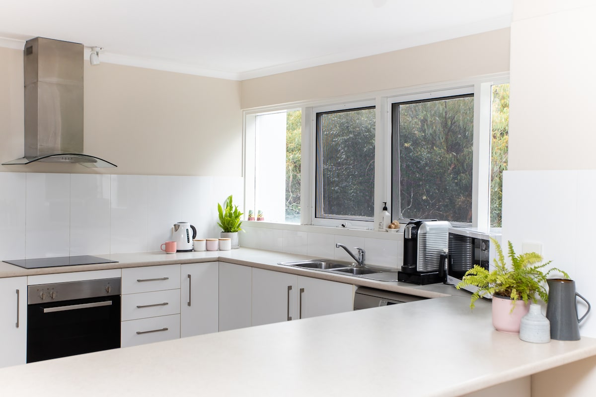 Fáilte go dtí The Cabin, tearmann rómánsúil a bhfuil an-tóir ag aíonna air atá suite i measc na gcrann agus radhairc ar an aigéan, díreach 7 nóiméad ó Thrá Burleigh, siopaí faiseanta Shráid James, bialanna agus beáir ar an gCósta Órga. Bain sult as dinnéar chic amuigh, ansin lig do scíth ag an teallach allamuigh le fíon agus marshmallows faoi na réaltaí. Tá teallach cloch (bréige) galánta, taobh istigh chic, agus gairdíní méith ina bhfuil go leor áiteanna scíthe le do scíth a ligean sa teach seo. Foirfe do lánúineacha atá ag lorg atmaisféar suaimhneach dúlra in aice le trá bhríomhar Burleigh!