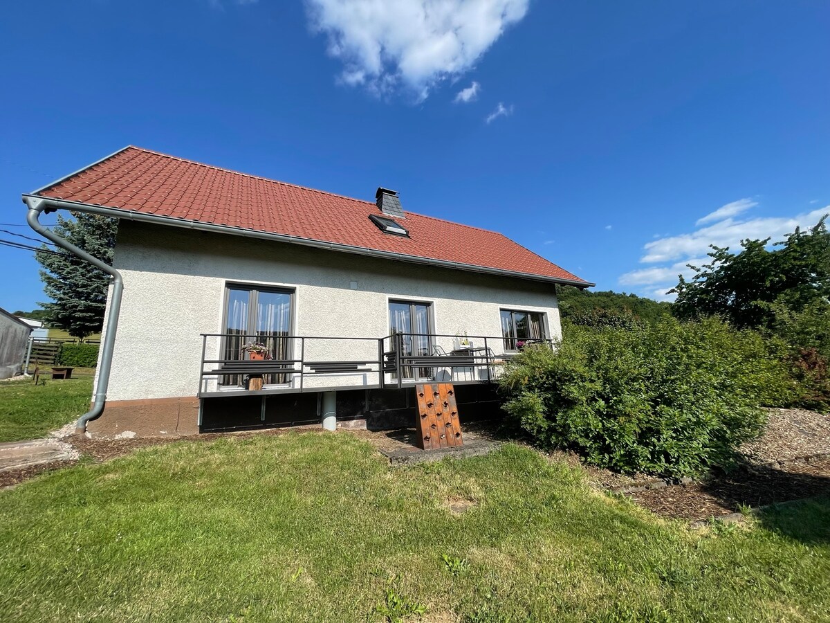 Tá ár dteach suite in Rüdenschwinden i gceann de na sléibhte ísle is áille sa Ghearmáin. Is sráidbhaile beag gleoite é Rüdenschwinden nach bhfuil i bhfad ón móinéar dubh agus Fladungen. Tá an teachín scoite agus tá gairdín 600 méadar cearnach fálaithe go hiomlán timpeall air. Anseo, gheobhaidh gach duine áit le do scíth a ligean, le súgradh nó le luí. Tá fáilte roimh mhadraí freisin. Tá spás páirceála do charranna sa réadmhaoin. Ón dá bhalcóin is féidir leat taitneamh a bhaint as radharc gleoite.