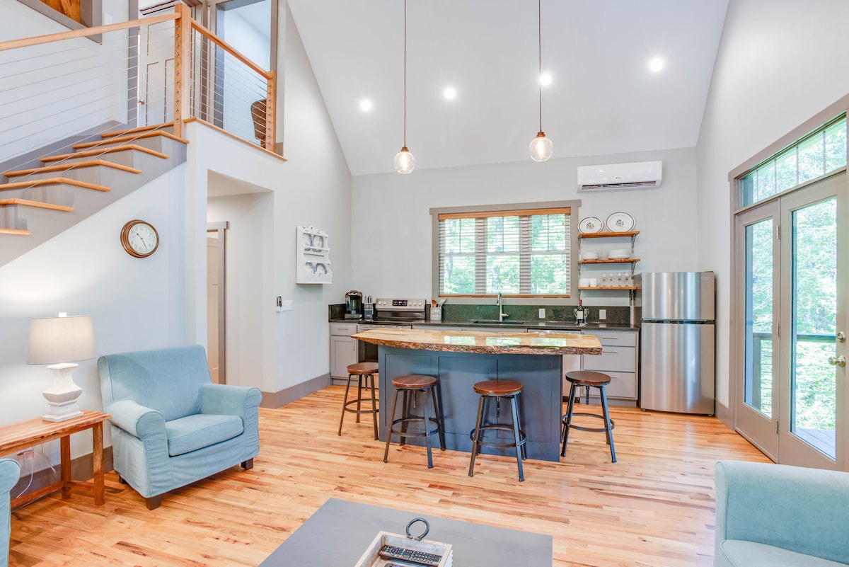 Éalaigh go Ellerslie Cottage – tearmann suaimhneach atá timpeallaithe ag crainn agus suite go hard san fhoraois, áit a bhfuil radhairc iontacha ar na sléibhte agus an tsuaimhneas is fearr ar fáil. Tógadh an teachín gleoite seo le déanaí agus tá atmaisféar álainn tuaithe-nua-aimseartha air. Tá 2 sheomra leapa agus 2.5 seomra folctha ann agus tá gach compord an bhaile ann i measc Shléibhte suaimhneacha Blue Ridge. Téigh amach ar an deic clúdaithe chun tú féin a thumadh go hiomlán san fhoraois—foirfe le haghaidh caife ar maidin nó manglaim tráthnóna. Níl sé ach 3.5 mhíle ó Hendersonville stairiúil agus cúpla nóiméad ó Dupont State Forest.