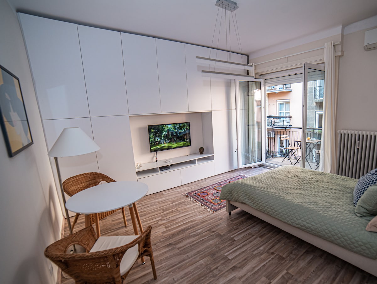Tá an stiúideo deas úrnua seo ag fanacht lena aíonna sna ceantair is áille agus is ciúine i lár na cathrach i mBúdaipeist, Tá gach rud a theastaíonn uait san árasán ar mhaithe le compord taistealaí, cistin lánfheistithe agus seomra folctha ina bhfuil cithfholcadán. Tá balcóin san árasán ina bhfuil radharc amach ar shráid chiúin. Níl an t - iompar poiblí ar fad ach cúpla céim ar shiúl. Ceann de na sráideanna is cáiliúla, timpeall cúinne inar féidir bialanna cáiliúla iomadúla a fháil.