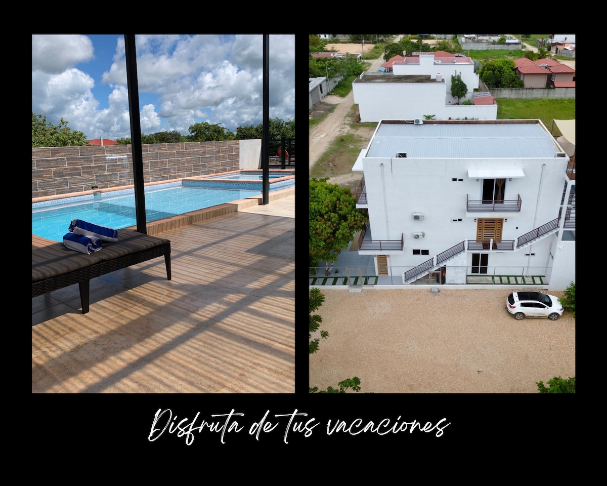 Teach fairsing dhá leibhéal le 6 sheomra le seomra folctha príobháideach an ceann , atá suite i gceantar lárnach na mbláthanna, céimeanna ón oileán álainn agus Mayan Mall , 5 nóiméad ón Aerfort Idirnáisiúnta World Maya , leis na compord go léir ar féidir le teaghlach nó cairde a bheith ag súil leo le haghaidh saoire shómasach, tá sé ina choimpléasc de 3 árasán dhá leibhéal le cistin an ceann agus seomra bia ar leith