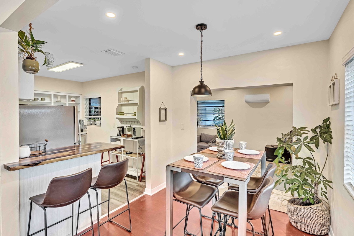 Éalaigh chuig d'óasas trópaiceach féin in Coconut Grove! Tá an teachín athchóirithe seo i stíl Key West ina bhfuil 2 sheomra leapa agus 1 seomra folctha, geataithe go hiomlán agus tá páirceáil áisiúil ann. Ar an taobh istigh, bain sult as bailchríocha uasghrádaithe amhail urláir mharmair, cuntair chistine eibhir agus seomra folctha nua-aimseartha. Bí ar do chompord agus ceangailte le haerchóiriú lárnach, teilifís chábla agus Wi-Fi. Téigh ag spaisteoireacht chuig cúirteanna leadóige in aice láimhe, chuig an mbá, chuig Coconut Grove Village, chuig siopaí, chuig bialanna, chuig clubanna agus chuig páirceanna—tá gach rud a bhfuil cáil ar Miami ina leith díreach cúpla céim ó do thearmann príobháideach!