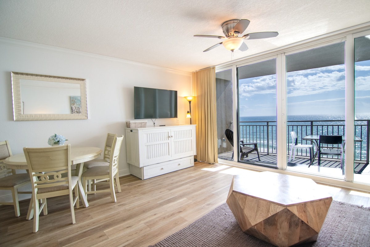 2 CHATHAOIR TRÁ SAOR IN aisce/ 1 SCÁTH FEARTHAINNE san áireamh leis an áirithint thru (15 Márta - 31 Deireadh Fómhair). Tá sé suite díreach ar an trá i PCB álainn! Tá leaba rí, tolg suíochán agus recliner san aonad seo. Tá cistin iomlán agus balcóin phríobháideach ann. Tá sé faoi fhad siúil chuig Gulf World, Pier Park, agus go leor bialanna. Tá cithfholcadán álainn siúil isteach sa seomra folctha. Tá a niteoir/triomadóir féin sa seomra seo. Tá Caife agus linn snámha théite ar an réadmhaoin ann freisin!