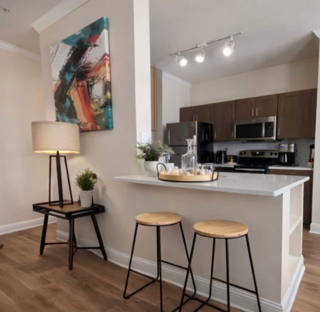 Árasán só 1BR i bpobal ardleibhéil ina bhfuil saoráidí iontacha: linn snámha, giomnáisiam, clóis teallaigh, agus garáiste páirceála. Tá Wi - Fi, dhá theilifíseán, caife, meaisín níocháin/triomadóir iomlán, agus folcadán nua - aimseartha le tobán san áireamh. Leaba rí le haghaidh compoird. Fad siúil go Whole Foods agus siopaí. 8 nóiméad go Rice Village, 12 go dtí an tIonad Leighis, 15 go dtí an Galleria, River Oaks, agus Montrose. Foirfe le haghaidh fanacht áisiúil, uasscála!