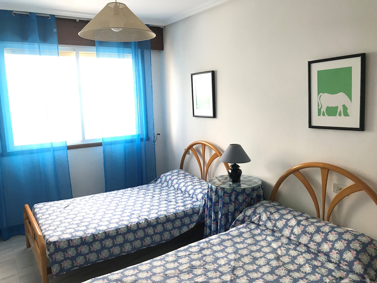 Este apartamento, situado en primera línea de playa, con vistas al mar cuenta con dos dormitorios: uno con cama matrimonial de 1,50m. y otro dormitorio con dos camas de 0,90 en literas. Situado en una privilegiada urbanización con acceso directo a la playa, cuenta con múltiples servicios como piscina , cancha de baloncesto, jardín infantil, jardín , duchas y acceso privado a la playa de Barreiros.