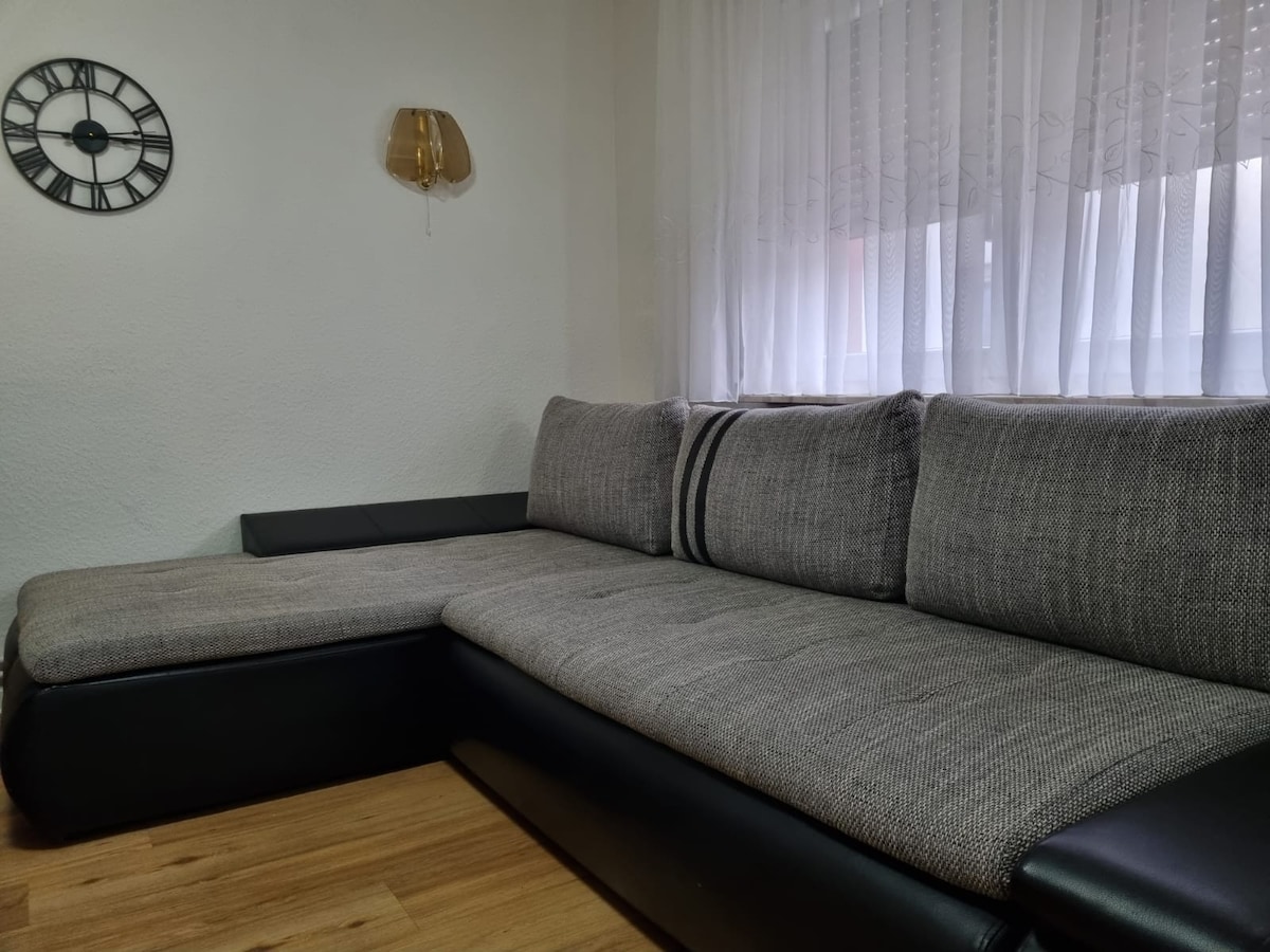 Inár Hofreite stairiúil in Friedrichsdorf tá árasán álainn dhá sheomra againn d'aíonna ina bhfuil thart ar 50 méadar cearnach. Tá cistin feistithe go hiomlán san árasán sa seomra suí agus bia, seomra leapa ina bhfuil leaba dhúbailte, leaba thoilg le dhá leaba agus seomra folctha mór sholas an lae le vanity dúbailte agus cithfholcadán mór. Tá ardán príobháideach ann freisin le suíocháin.