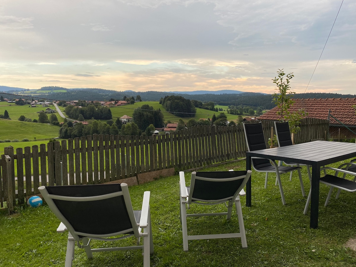Eine eigene, schöne 2-Zimmer-Wohnung im Obergeschoss unseres Hauses. Super ruhig und naturnah gelegen am Ende einer Sackgasse mit atemberaubender Aussicht vom geräumigen Südbalkon. Schlafzimmer, Wohnzimmer mit Küche, Badezimmer mit moderner Dusche und Badewanne. Wir lieben Tiere und haben daher Hühner, Enten und Katzen auf unserem Grundstück. Je nach Saison kriegt ihr bei uns auch Frisches aus dem Garten! 20 Min zum Nationalpark 6 Min zum Supermarkt 35 Min nach Passau