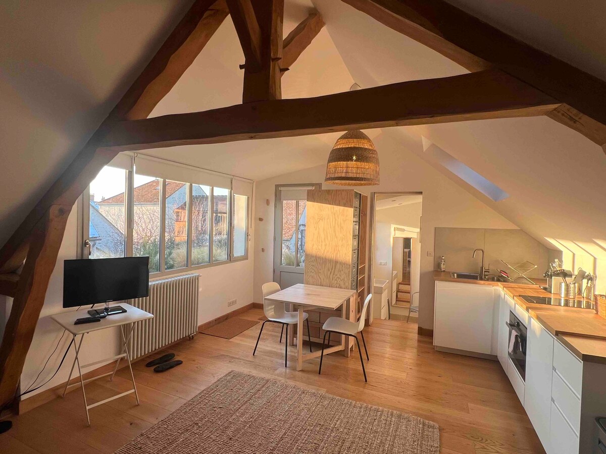 Stiúideo neamhspleách úrnua galánta galánta atá deartha i spiorad Teach Beag Bídeach atá suite i sráidbhaile álainn Boissy aux Cailles. Tá ardán ar leith agat le radharc iontach ar an bhforaois agus ar na carraigeacha atá ag breathnú amach ar an sráidbhaile. Go hidéalach in aice leis na láithreáin dreapadóireachta is mó tóir i bhforaois Fontainebleau (na trí gables, Buthiers, Larchant, Nemours, La forêt domaniale), bunáit fóillíochta Buthiers chomh maith le galf Augerville.