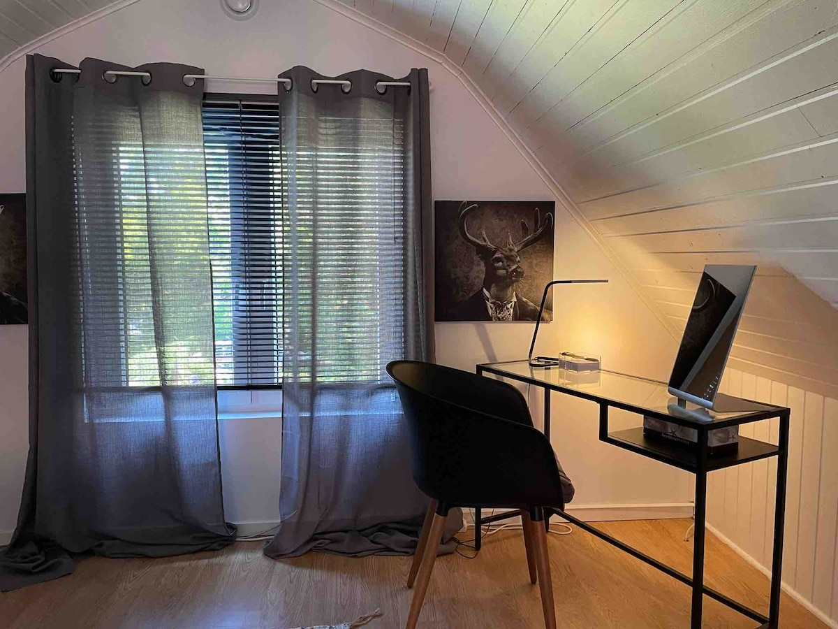 Teach aíochta nuathógtha i ngairdín an teaghlaigh óstaigh lena leithreas agus cithfholcadán féin atá fada go leor ar shiúl chun nach gcuirfidh an mótarbhealach E6 isteach air ach gar go leor chun a bheith in ann páirceáil dhá nóiméad tar éis duit é a fhágáil. Áit chiúin, tuaithe le cúpla comharsa. Níl aon fhadhb le páirceáil agus tá áiseanna luchtaithe ar fáil do thiománaithe feithiclí leictreacha ar chostas féin. Íocfar an táille ar an láthair. Glacann le SEK agus EUR chomh maith le Swish