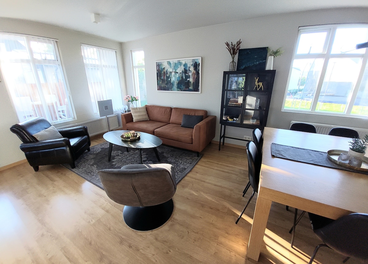 Beautiful and stylish one-bedroom apartment. The apartment is on the 3rd floor, with cozy furnished balconies. The main bedroom has a king-size bed and the second one has a brand new and comfortable sleeping couch. The living room has a big smart TV, the kitchen is fully equipped and there is a washing machine and dryer in the bathroom. The apartment is in 5 min walking distance to Bonus supermarket as well as Cosco and Dæinn coffeehouse. Only 15 min drive to downtown Reykjavik.
