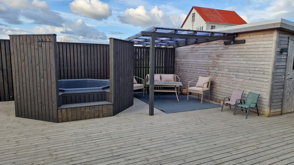 Notalegt fjölskylduhús með heitum potti.