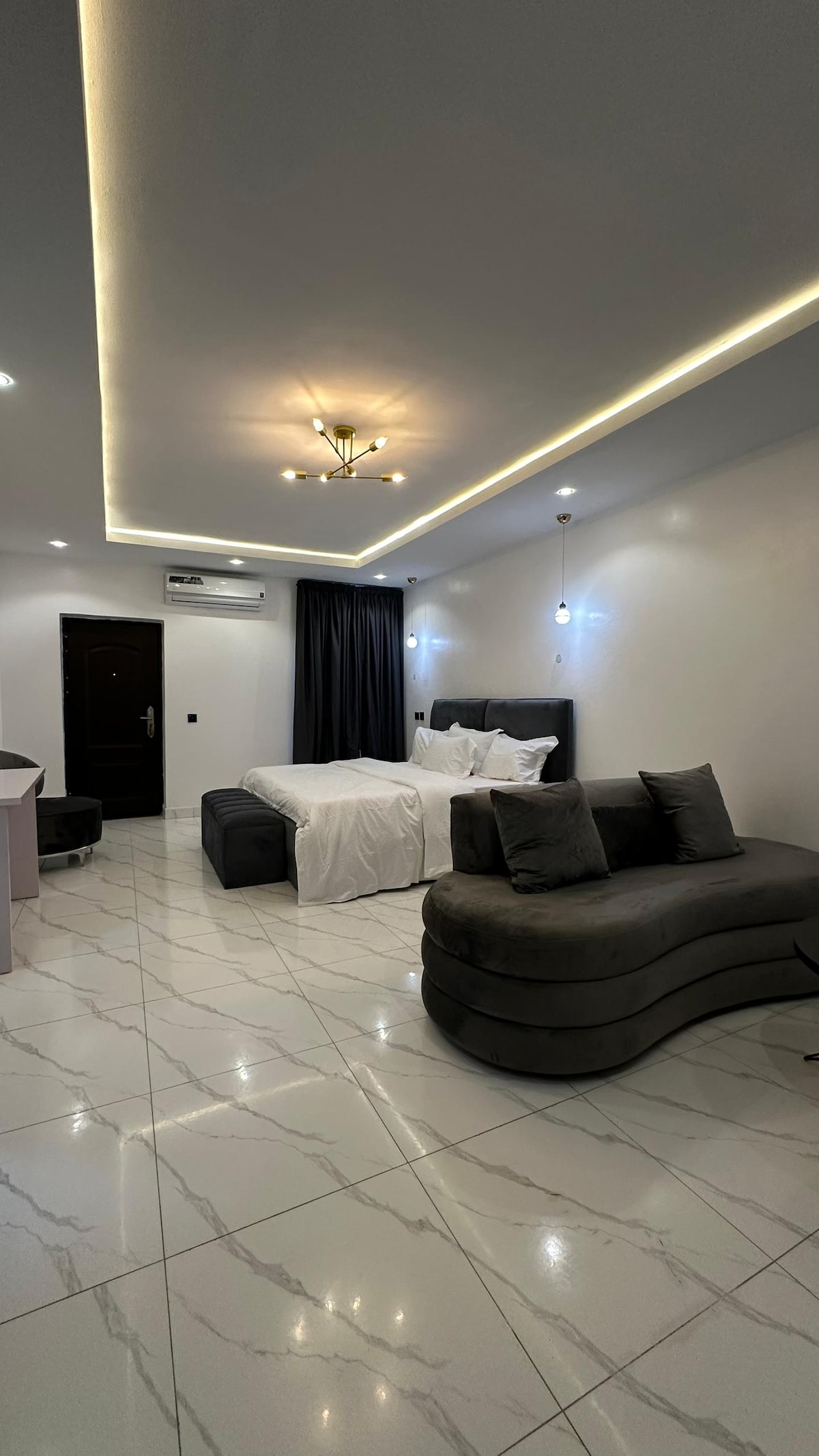 Experience a blend of class, intentional furnishing and space for your maximum comfort in my Attic Studio Apartment. The stairway leading to the Attic exudes Royalty and magnificence; overseeing a play ground replete with table tennis, snooker board, TV game corner, Gym and a Pool. It runs sustainably on a solar powered inverter, standby generator and a relatively stable power supply as a compliment. Apartment has air conditioning unit, water heater and a fully equipped open plan kitchen