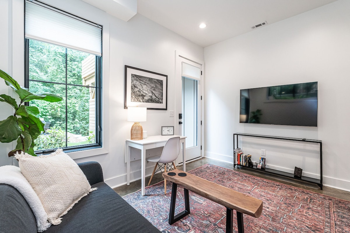 Tuirseach de sheomraí óstáin cromtha bland? An fearr leat fanacht i seomra aíochta cluthar, deartha go cúramach, spreagtha ag an Nordach i gcomharsanacht áisiúil, chiúin, ghlas le caife, grósaera, sushi, agus bia breá inar féidir siúl agus achar gearr tiomána ó Cheantar na Sráidbhaile, Ollscoil Stáit Carolina Thuaidh, agus áiseanna lár na cathrach ar nós amfaitéatar Red Hat, Halla Ceolchoirme Meymandi, Ionad Comhdhála Raleigh, páirc Dorothea Dix, agus go leor eile?Más ea, b'fhéidir go mbeadh dearadh spreagtha suaimhneach an tseomra suite príobháidigh seo ar an íoslach oiriúnach duit!