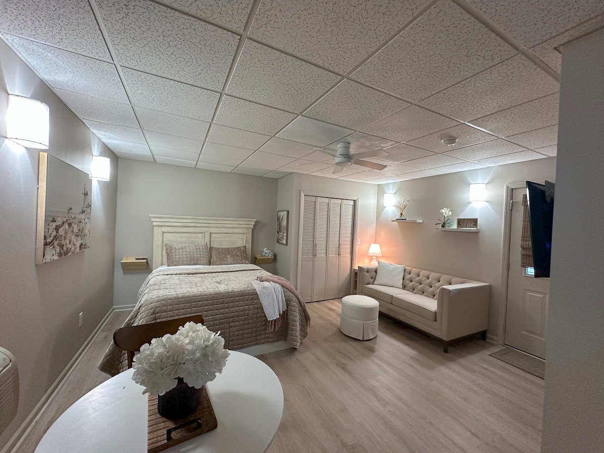 Relax w/family. Full kitchen/living area, bathroom w/walk-in shower, large bedroom w/queen bed & work space. Coffee bar includes Espresso maker & milk frother. Couch is queen sleeper/sofa. Toddler cots, travel crib & assorted baby/toddler essentials available. Playground w/park benches, picnic tables for adults & children. Private deck w/seating. Laundry, gym equipment & In-ground pool (registered guests only). Standby generator and water purification system. Parties & gatherings not permitted.