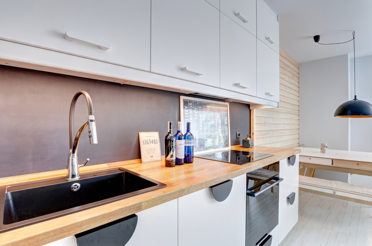 An féidir leat radhairc fhoirfe cártaí poist, compord ardleibhéil, agus dáileog cheart scíthe a chur le chéile tar éis lá iomlán taiscéalaíochta sa chathair? Is féidir leat – agus gheobhaidh tú é go léir ar urlár uachtarach an fhoirgnimh nua - aimseartha ag Chmielna 63, áit nach bhfuil compord ach só, ach riachtanas. Tá níos mó i gceist leis an díonteach galánta seo ná áit chodlata amháin - is spás ilghnéitheach é ar féidir leis freastal ar do riachtanais uathúla. Ina theannta sin, tá ardán príobháideach fairsing ann ina bhfuil radharc iontach ar spéirlíne Sheanbhaile Gdańsk.