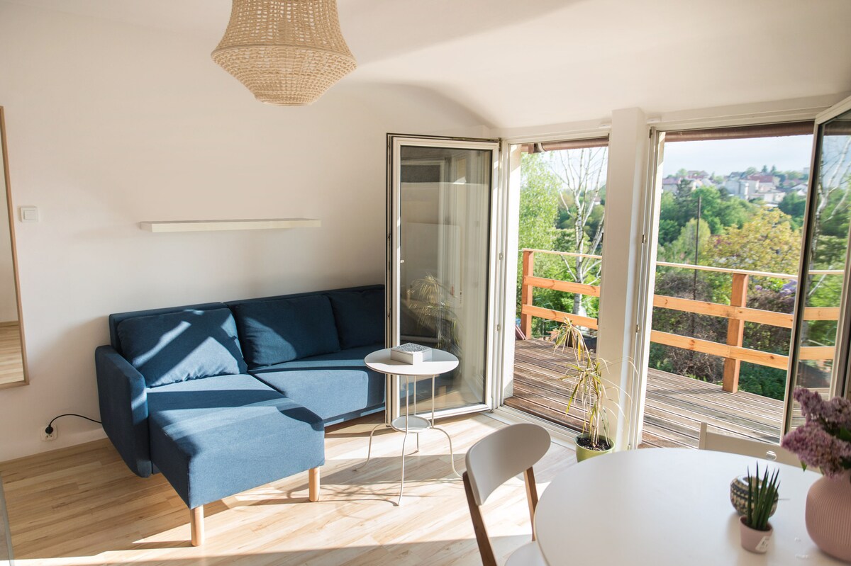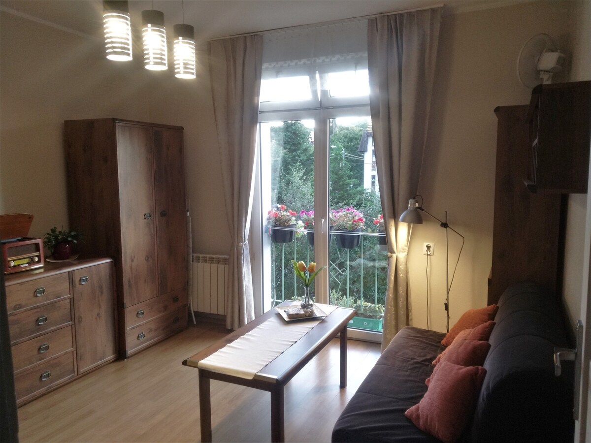 Młoda Polska – a modern apartment with an artistic touch in a green part of Sopot. It is located on the 2nd floor of a building with an elevator. It consists of a bedroom with a double bed, a living room with a sofa bed, a kitchenette with a dining area, a bathroom with a shower, and a balcony. Guests also have access to a garage with an assigned parking space. It is a great base for those who value peace and quiet and quick access to the entire Tri-City.