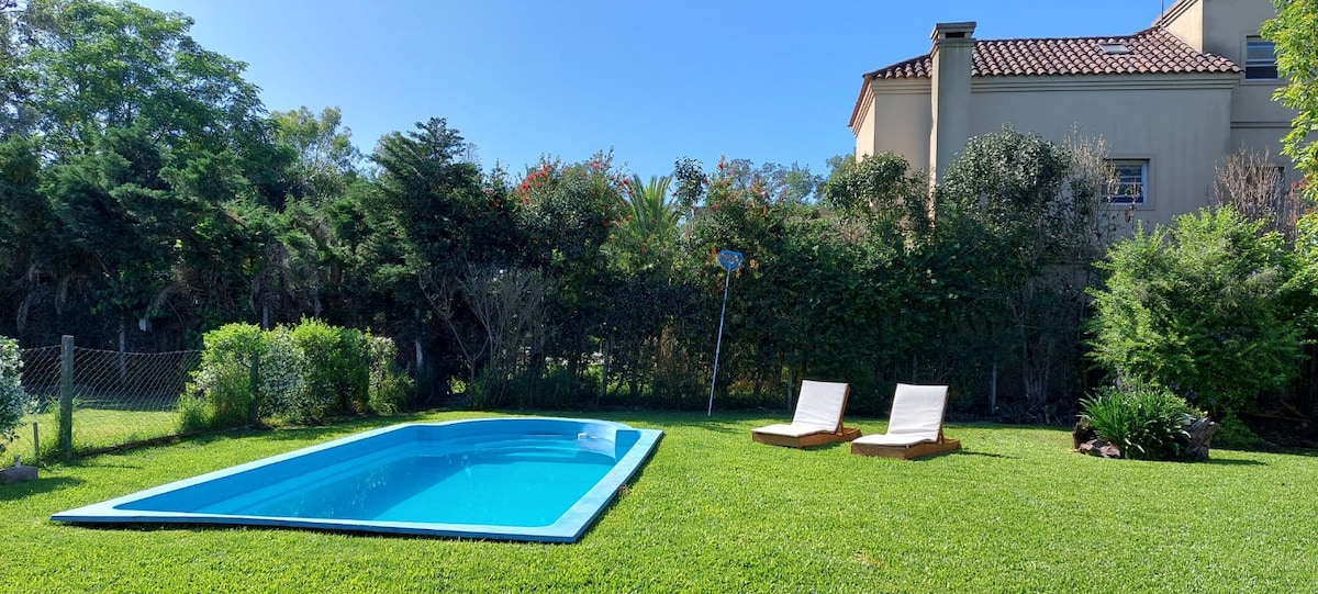 La casa está cerca de todo; a 10' del hospital Austral. A 10' de centros comerciales 15' de club's de Polo de la zona. El barrio es muy tranquilo, la calle esta cerrada con tranquera de campo. wifi fibra óptica La casa tiene detalles simples, que respiran amor y dedicación. Los colores luminosos de la casa, son parte del descanso. Lo mejor es el parque y la galería. cuando hace frío o es hora de descansar, tirarse en los sillones, sin dejar de disfrutar el afuera por el ventanal es fantastico