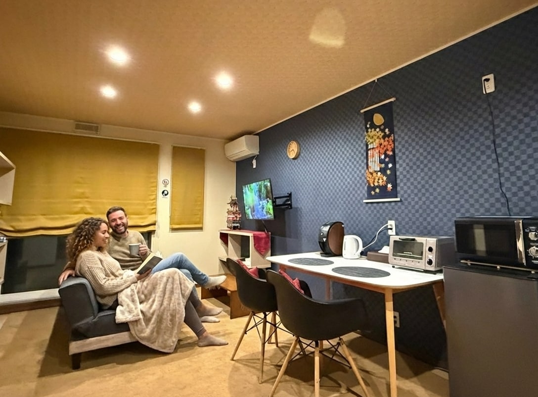 A private 100-year-old townhouse in front of a quiet shrine. The first floor features a living, dining, and kitchen space with natural wood flooring and plaster walls. Upstairs are three connected tatami rooms. Located on a peaceful hill, just a 5-min walk to the old town. Surrounded by temples and greenery. Please keep quiet at night as it’s a residential area.