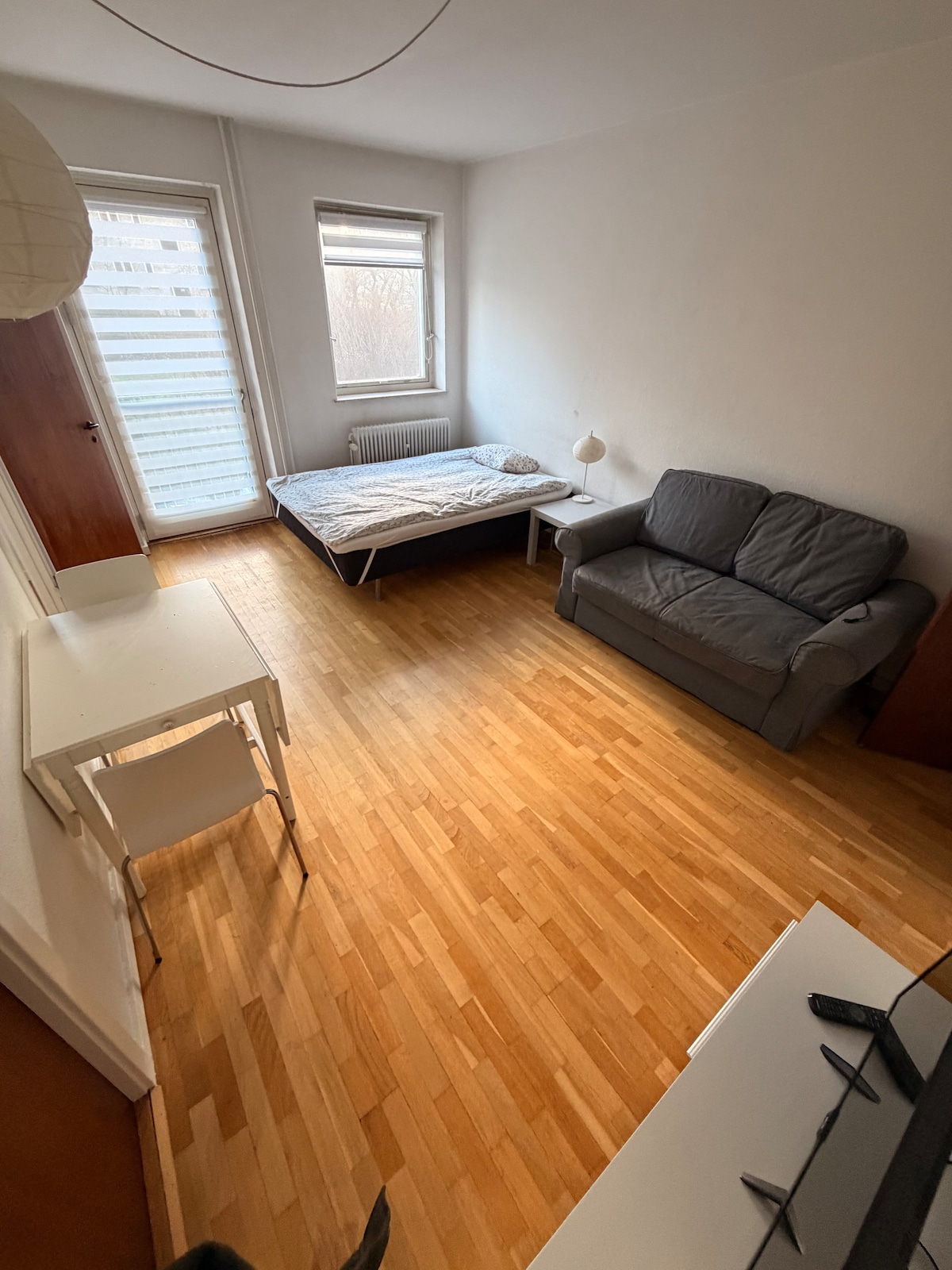 Lille gæstehus (et værelse og et toilet) med dobbeltseng og sovesofa, minikøkken med køleskab og en enkelt kogeplade og microovn, spiseplads, toilet, tv og adgang til terrasse. Adgang til bad i hovedhuset efter aftale. Dyner og puder med betræk. Gratis parkering. Mulighed for opladning af elbil med type 2 stik. Busser til centrum tæt på, det tager 20 minutter at komme derind. NB. Sovesofaen er ikke så bred og egner sig bedst til en enkelt voksen eller to børn eller to voksne der vil ligge tæt.