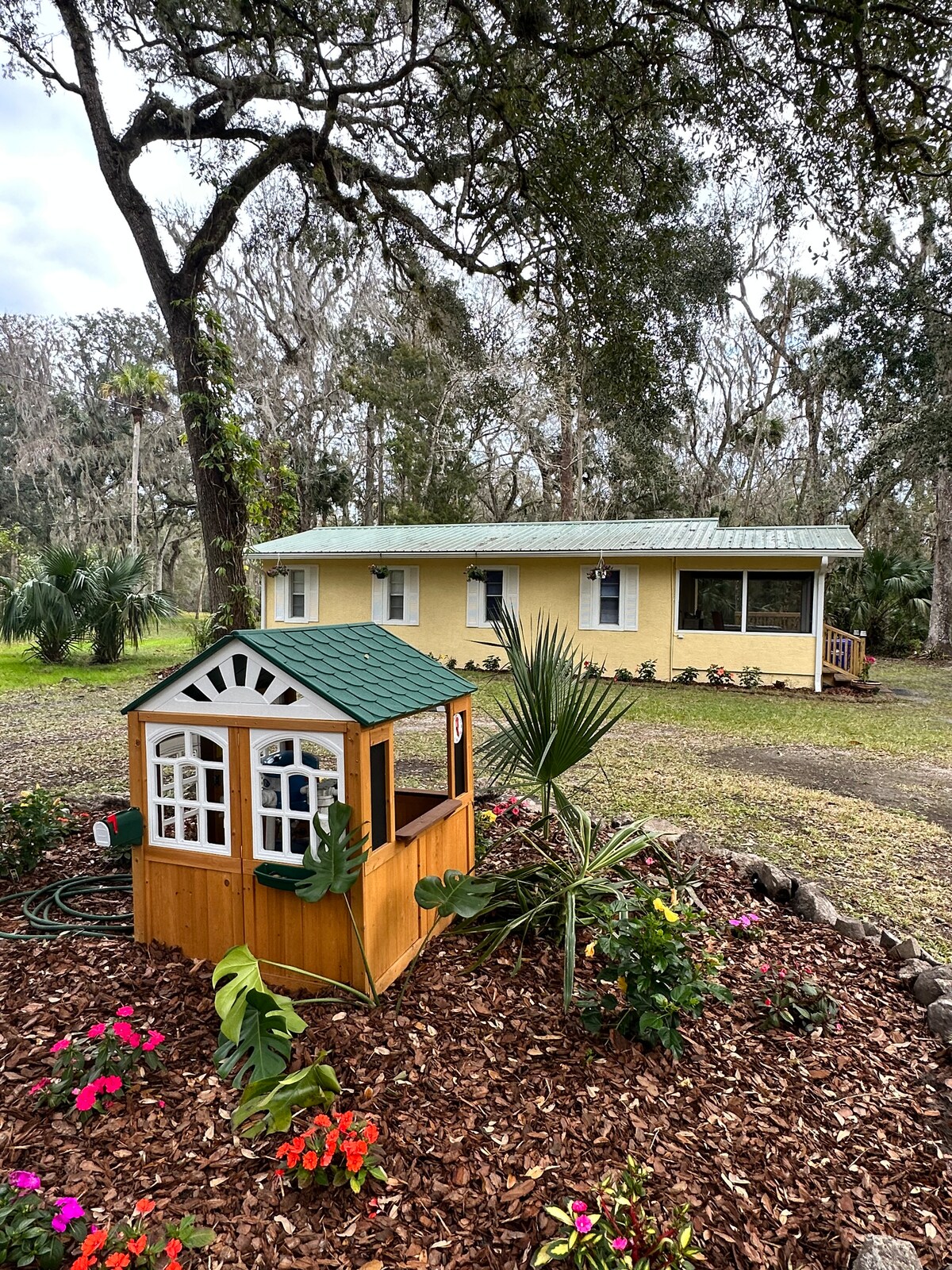 Creekside Guest House — do shaoire phríobháideach ar imeall an chreagáin! Cábán teolaí dhá stór le 2 sheomra leapa agus 1 sheomra folctha, deic álainn ag breathnú amach ar an gcroiméal suaimhneach, paitió ar ais le tobán te boilgearnach, gríoscán agus suíocháin. Bain sult as cluichí cúlchlós, cláir chéaslóireachta le haghaidh eachtraí creek, agus mionfheirm le sicíní cairdiúla agus gabhair spraíúla a thairgeann beathú faoi mhaoirseacht. Níl ach 2 -3 mhíle ó New Smyrna Beach — cúlráideach, príobháideach, agus foirfe chun saoirí gearra a scíth a ligean.