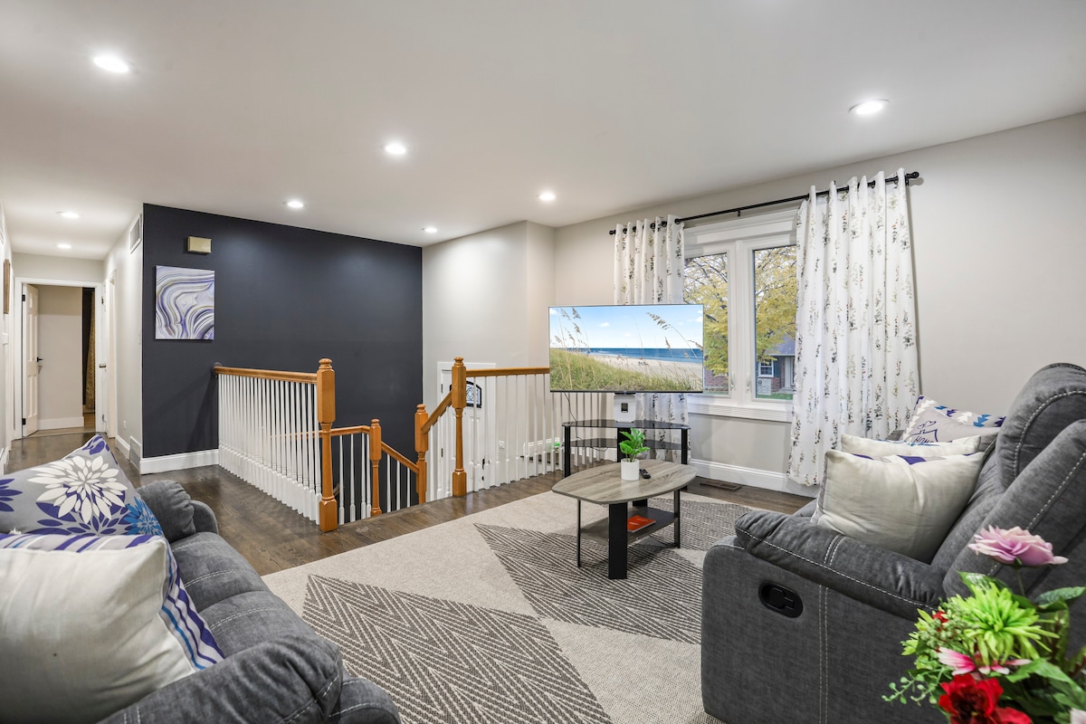 Fáilte go Charisma, rainc ardaithe fhairsing 5 sheomra leapa in Glendale Heights ina bhfuil 5 leaba rí, 2 sheomra folctha iomlána, agus neart spáis do theaghlaigh nó do thaistealaithe gnó. Tá 3 sheomra leapa, seomra folctha iomlán ina bhfuil tobán, agus limistéar oscailte ina bhfuil an seomra suite, an seomra bia agus an chistin ar an urlár uachtarach. Osclaíonn an limistéar sin amach ar dheic mhór ina bhfuil gríoscán gáis agus radhairc ar an gclós cúil atá fálaithe go hiomlán. Tá 2 sheomra leapa breise, an dara seomra folctha, agus bealach isteach díreach tríd an ngaráiste dhá charr atá ceangailte leis an teach ar an leibhéal íochtarach.