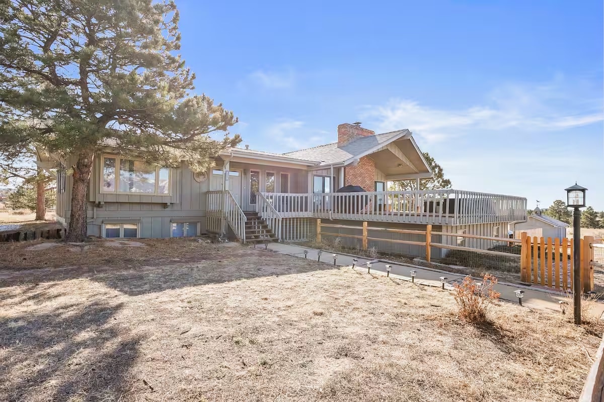 Leibhéal iomlán níos ísle tí le hiontráil phríobháideach. Radharcanna iontacha de Pikes Peak i gCroílár na Foraoise Duibhe. Is suíomh iontach ciúin é seo le rochtain éasca ar I -25, Highway 83 agus na rudaí spraíúla ar fad le déanamh in Colorado Springs. Féach ar Pikes Peak agus Acadamh an Air Force ón bpaitió príobháideach luamhán íochtarach! Dhá sheomra leapa le Leapacha Banríona, Tocht Aeir Cúpla ar fáil freisin. Seomra Folctha Príobháideach, Tolg, Suíochán Grá, Wi - Fi, Teilifís, Cuisneoir. Rochtain ar Threalamh Aclaíochta. Níl cistin sa spás.