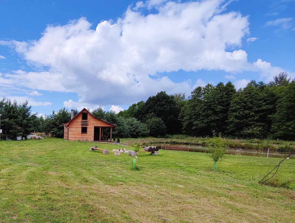 Teachín adhmaid ina bhfuil atmaisféar uathúil cois na foraoise. Tá lochán ann ar a bhfuil duga díreach in aice leis an teach. Tá bád agus adhmad saor in aisce ann don teallach agus don pholl tine. Ag achar 10 km, tá linn snámha le sauna, trá saor in aisce, 12 km ón teach ar cheann de na cúrsaí gailf is áille san Eoraip - Modry Las. Tá an dara teachín ar cíos glas in aice láimhe ar an réadmhaoin. Cíos na réadmhaoine iomláine faoin ainm: "Tithe locháin in aice na foraoise - réadmhaoin phríobháideach" ar phraghas 590 zł/oíche