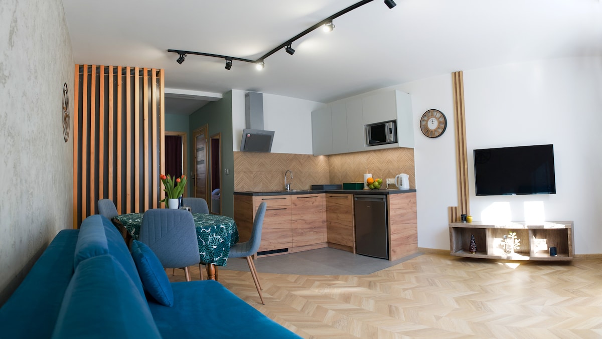 Chose our place if you like modern apartments with a cozy atmosphere. Our place can serve you as your holiday spot and be your place to work remotely, taking advantage of being close to the mountains. You can plan your daily excursion with the help of a giant map of Beskid Niski on the wall and afterward relax with a glass of wine in front of the fireplace. The apartment is located on the ground floor of a new building "Villa Wierch" in Krynica Zdrój, walking distance from many attractions.