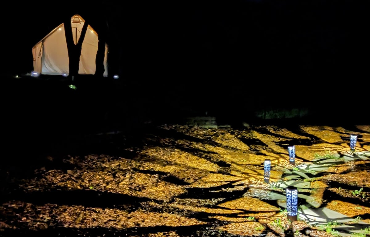 Agus é sáite sa dúlra, soláthraíonn an gazebo saoire sa dúlra, lena leaba dhúbailte agus a sheomra pearsanta ar mhéid is spás iontach é seo do 2 cheann a thumadh i dtimpeallacht shíochánta. Cé acu ar tháinig tú anseo chun do scíth a ligean nó chun iniúchadh a dhéanamh go bhfuil neart le bheith ann! Tá buidéal inmhúirínithe in aice láimhe sa gazebo (roinnte le haíonna eile), agus níl ach siúlóid 1 nóiméad ar chosán sa choill chuig an bpríomhtheach (áit a bhfuil an seomra folctha iomlán ar féidir é a úsáid 9am -8pm).