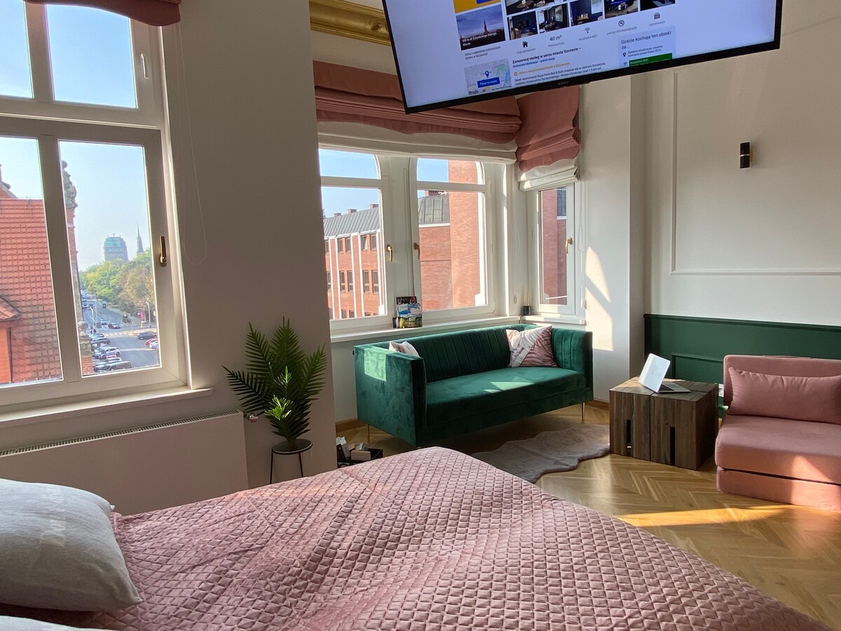 Áit theolaí i lár Szczecin. Go maith do lánúin, do theaghlach, do chairde nó do dhaoine atá ag taisteal le haghaidh gnó. In aice láimhe: grósaeireacht, caiféanna, bialanna, iompar poiblí, iarnród agus stáisiún bus. Fad siúil chuig an seanbhaile agus imeall an uisce. Tá an scaradh geal teolaí le críochnú nua - aimseartha agusseanré. Tá 2 sheomra ann: seomra suí + cúinne codlata le rochtain ar bhalcóin álainn agus seomra leapa le leaba agus pianó dúbailte. Idir na seomraí cistin nua - aimseartha agus seomra folctha nua.
