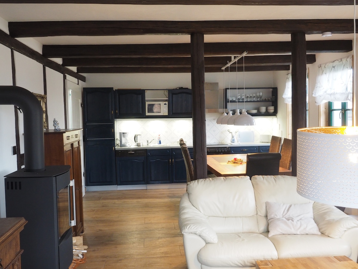 Seo an dóigh le fanacht ar laethanta saoire: Trí sheomra leapa dhúbailte agus trí sheomra folctha cithfholcadáin, cistin sárfheistithe, teallach, seomra bia, cistin bheag pantry ar thaobh an chnoic, áit mhór ardáin le troscán agus radharc iontach ar shléibhte Harz ó gach áit. Tá seomra leapa dúbailte agus seomra cithfholcadáin suite ar thaobh an chnoic agus is féidir teacht orthu trí staighre tuathúil ón mbunurlár.