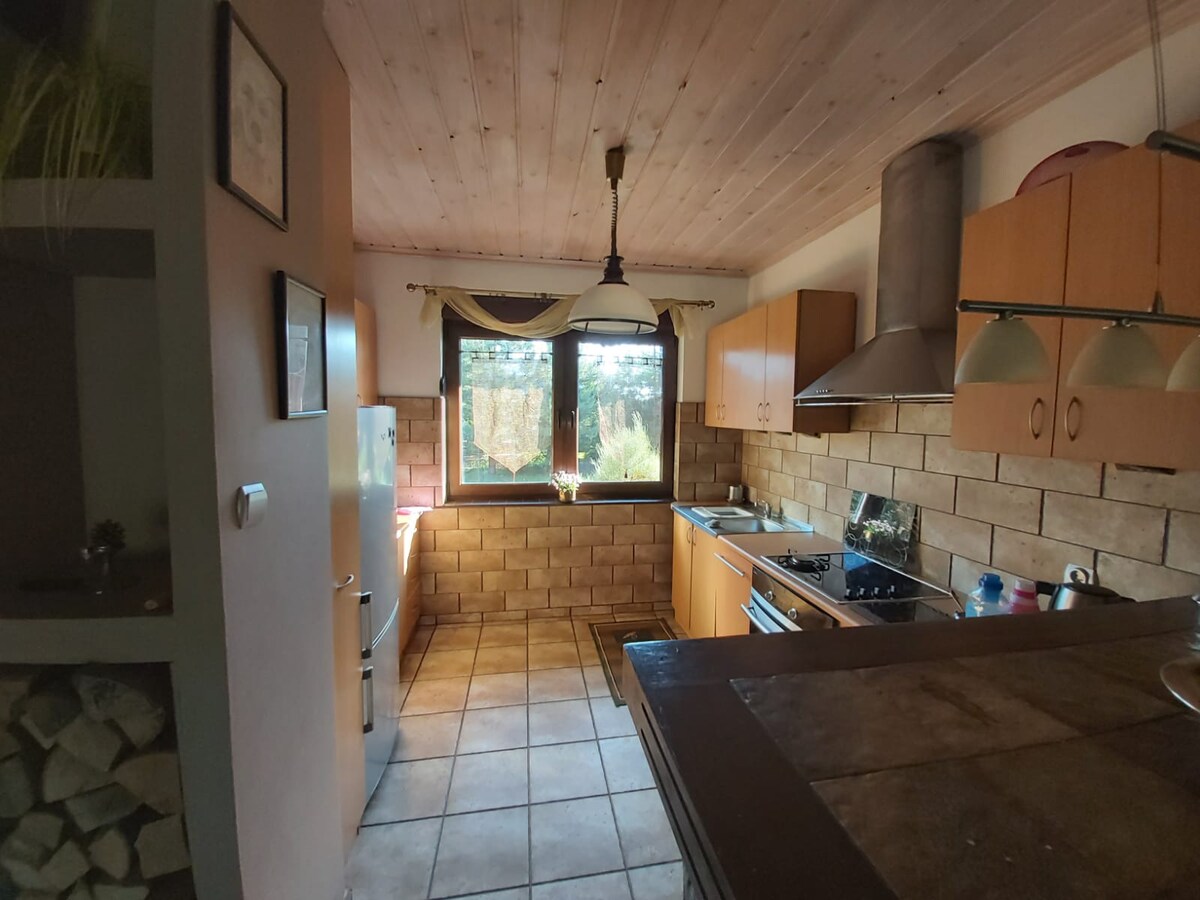 Is teach saoire só mór álainn 175qm é seo a tógadh in 2016 ar phlota 900 méadar cearnach mór fálaithe. Tá sé suite ar OILEÁN Wolin (cósta Bhailt Iarthar na Polainne ),km soir ó Miedzyzdroje. Is féidir leat suaimhneas iomlán a fháil anseo.Tá an teach suite 50m ó Pháirc Náisiúnta Wolin (foraois iontach) agus 1,2km tríd an bhforaois seo go dtí an trá. An trá féin: trá ghainmheach leathan, leathan, fhada, bhán. Sa teach: áit dóiteáin + sabhna agus 5 sheomra leapa (4 x leaba dhúbailte + seomra le 2 leaba bhuinc do pháistí)