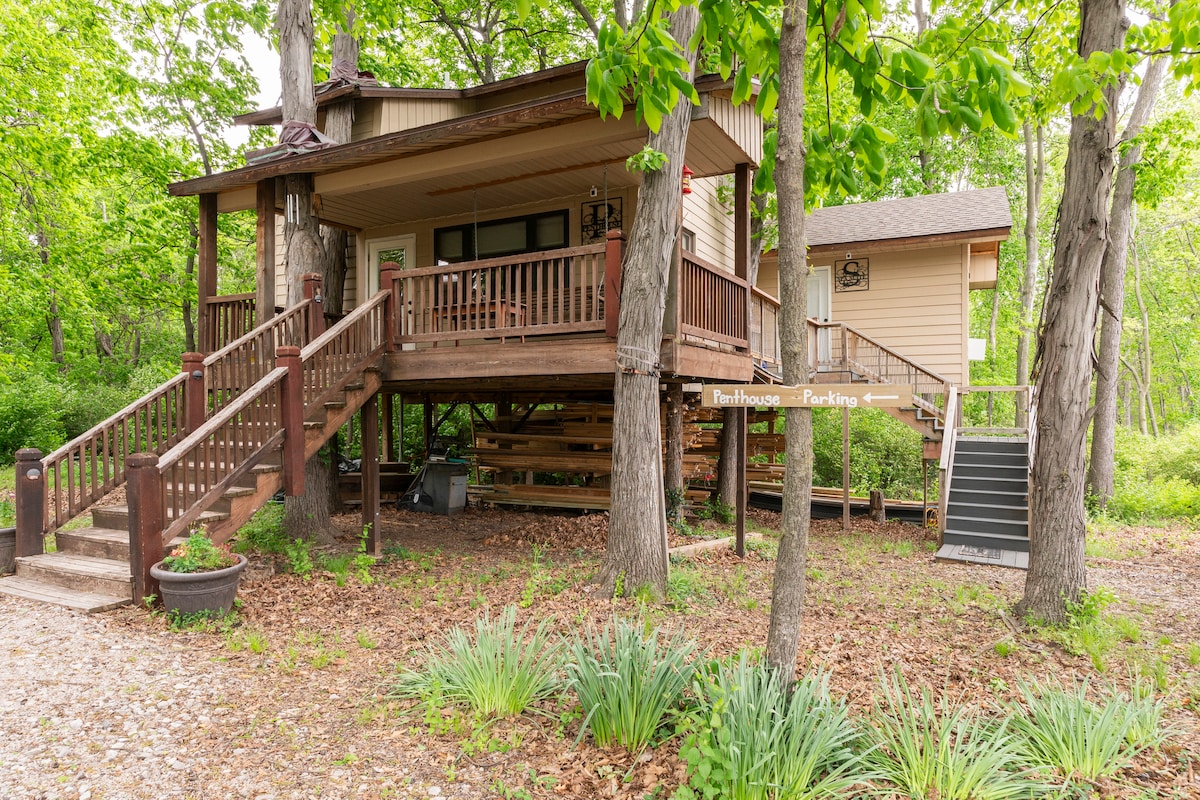 Tá an teachín gleoite athmhúnlaithe seo suite go háisiúil idir Grafton agus Alton, IL ar bharr an ghormáin, go hard os cionn Abhainn Mississippi agus Bóthar na hAbhann Móire. Tá an teachín 2 sheomra leapa seo i suíomh príobháideach coillearnaí atá foirfe do d'éan agus do d'fhéachaint ar an bhfiadhúlra. Tá go leor iolar, turcaí agus fianna feicthe againn. Cé nach bhfuil Wi - Fi sa teach, tá limistéar féachana WiFI agus Abhainn gar do Bhaile Átha Cliath.