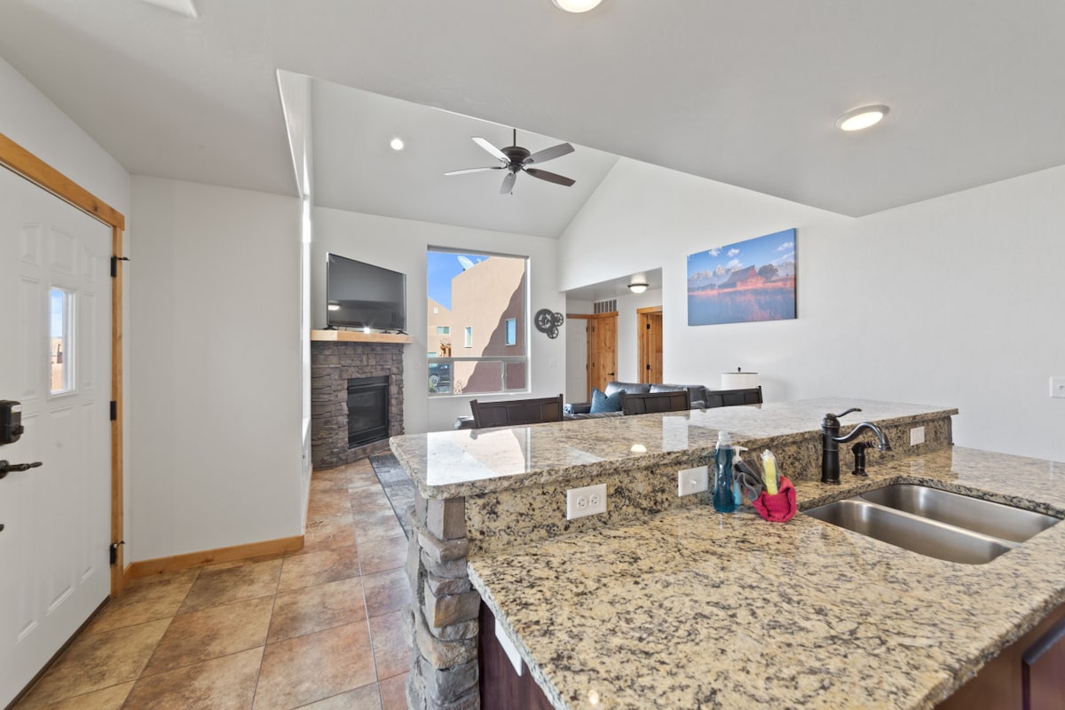 Neadaithe i dtírdhreach iontach carraigeacha dearga Utah, is é Oasis Townhome an meascán foirfe eachtraíochta agus scíthe atá agat. Bain sult as radhairc iontacha, fánaíocht, stáirseáil, easbhóthair, siopadóireacht, bia, agus go leor eile. Níl sa tearmann nua - athchóirithe trí sheomra leapa seo ach nóiméad ó lár na Móibe agus tá tobán te príobháideach, bord foosball, linn snámha pobail, cistin lánstóráilte, agus na vibes is fuaire i Moab. Ina theannta sin, tá sé oiriúnach do pheataí! 🐕