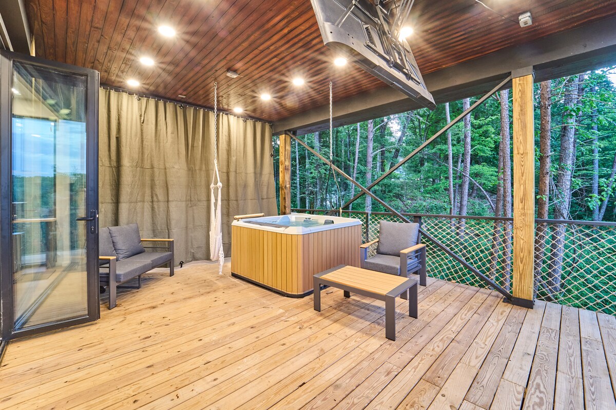 Lánúineacha ❤️ Aird! ❤️ Cábán ✔️ Cluthar & Pearsanta - Saoire Rómánsúil Foirfe ✔️ Radhairc Shléibhte Néalacha & Sunrises Álainn Tobán Te & Sabhna✔️ Suaimhneach Seomra Amharclannaíochta✔️ Pearsanta Leaba ✔️ King - Size Cistin ✔️ dea - fheistithe ✔️ Teallach & Poll dóiteáin w/ Swing Teilifíseáin ✔️ Chliste & Wi - Fi Tapa Gnéithe ✔️ Uisce agus Lochán ✔️ Gineadóir Cúltaca Suite go háisiúil 📍25 nóiméad go dtí Colm Forge 📍20 nóiméad go Gatlinburg