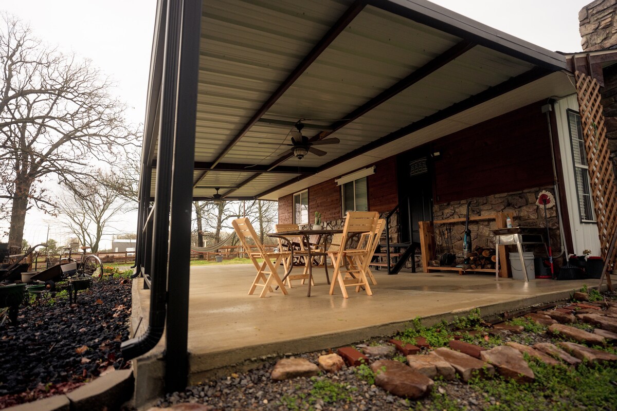 Teach feirme stairiúil nuashonraithe. Taobh istigh glan, cluthar agus compordach. Clós mór fálaithe. Cabhsa pábháilte, cosáin tí agus páirceáil. Tá teachín ar fheirm phictiúrtha ina bhfuil féarach eallaigh, cnoic, abhainn agus crainn ghiúise. Tá an fheirm suite díreach taobh amuigh de bhaile beag sábháilte Gentry, 15 nóiméad go Siloam Springs agus go dtí aerfort XNA, agus tá Bentonville 20 míle ar shiúl. Tá do shásamh tábhachtach, déan athbhreithniú ar eolas agus ar pholasaithe tí sula ndéanfaidh tú áirithint.