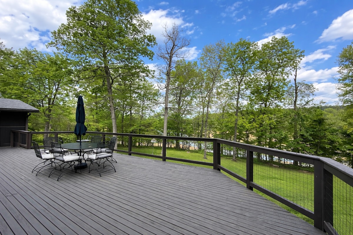 Cuireann an teach seo áit fhairsing ar fáil le haghaidh scíthe agus spraoi! Tá radharc álainn ar Rough River Lake ón deic chúil an - mhór. Tá deic bheag uachtarach ann freisin a nascann leis an seomra leapa thuas staighre. Tá dhá sheomra leapa ar leibhéal uachtarach an tí (ceann acu ina leaba bhanríona agus an ceann eile ina leaba bhuinc) agus seomra folctha mór. Tá trí sheomra leapa ar an leibhéal íochtarach (banríon amháin agus dhá leaba iomlána), an seomra bia, an chistin, an seomra suí, agus an seomra folctha/seomra níocháin. Neart spáis don teaghlach agus do chairde!