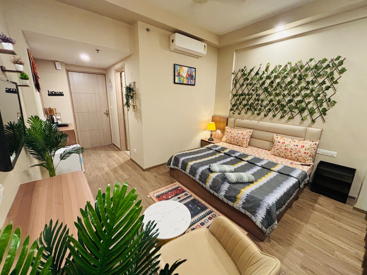 Fully furnished luxurious studio apartment with all modern amenities available in Greater Noida near Metro station. Luxurious , Specious and Couple friendly studio in Greater Noida Near Expo Mart. What You’ll Love: ✔ Unique Interior – Enjoy the Mesmerizing Interior. ✔ Modern Comfort – A beautifully furnished space with a comfy bed, cozy seating, and stylish decor. ✔ Fully Equipped Kitchen – Cook your favorite meals with ease. ✔ Fast WiFi & Smart TV – Stay connected and entertained.