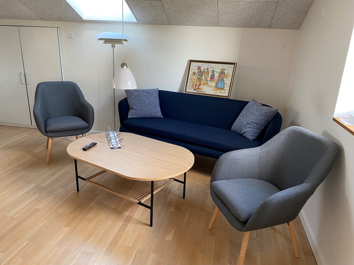 appartment áiléir éadrom teolaí le 45m2 san iar - chobhsaí d'fheirm álainn ó 1894, suite in aice le Muir Wadden idir baile stairiúil Ribe agus metropole fuinnimh na Danmhairge Esbjerg. Tá siopa grósaera in aice láimhe (500m), a osclaítear 7 lá na seachtaine.
