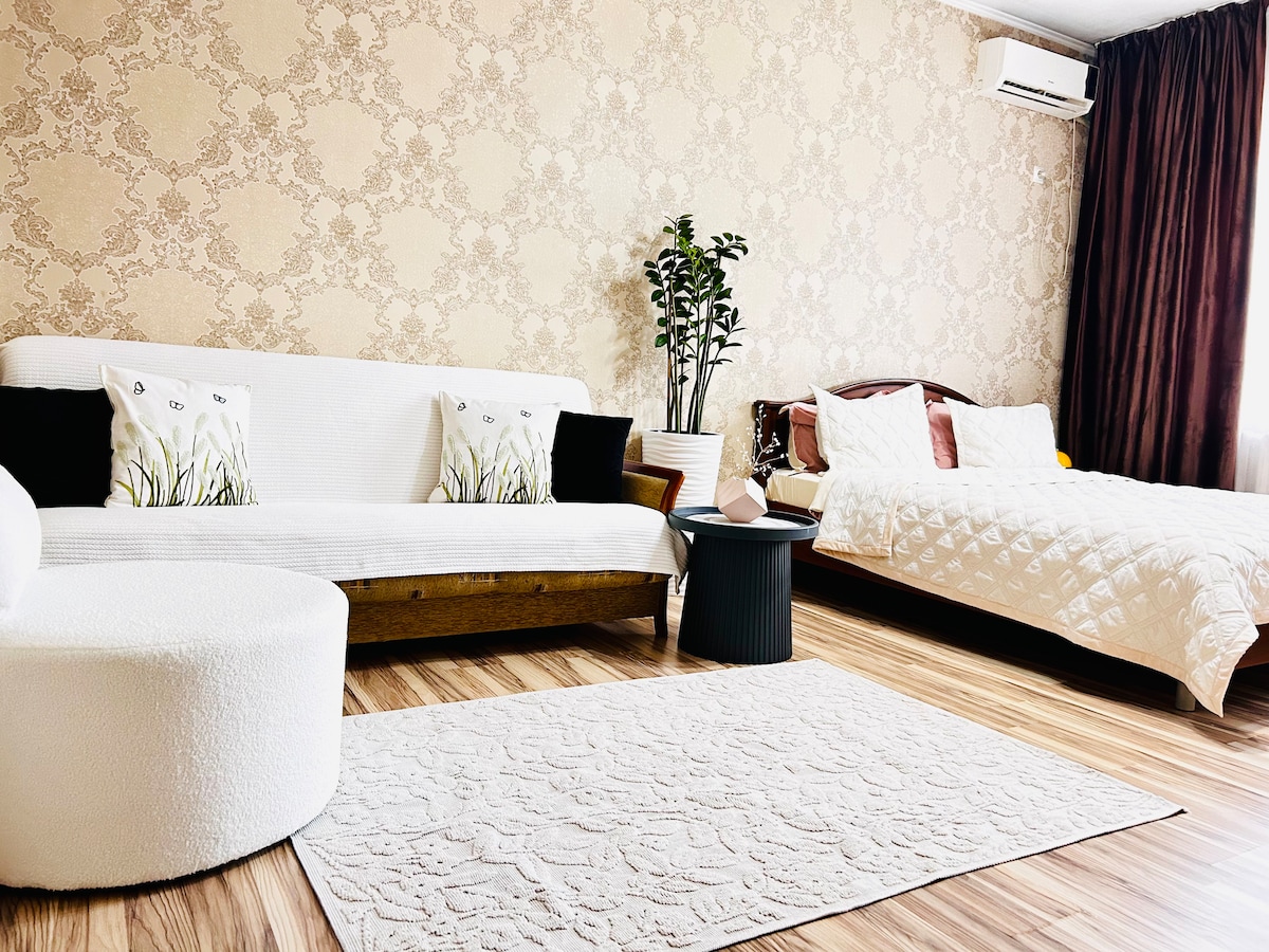 Fáilte chuig d'fhanacht aisling i gcroílár na cathrach i stíl Japandi! Níl ach céimeanna ar shiúl ó na nithe is díol spéise is fearr sa chathair - go háirithe níl ceantar Arbat ach cúpla nóiméad siúil. Taobh istigh, tá toin adhmaid the, maisiúchán blasta agus saoráidí nua - aimseartha sa spás lena n - áirítear miasniteoir, meaisín níocháin agus triomadóir in - aonad, Wi - Fi ardluais, agus go leor eile. Téigh taobh amuigh agus déan iniúchadh ar chomharsanacht bhríomhar ina bhfuil go leor bialanna ina bhfuil éagsúlacht cuisine. Chun ionad mór a shiopadóireacht tá “Mega Park” díreach trasna na sráide.