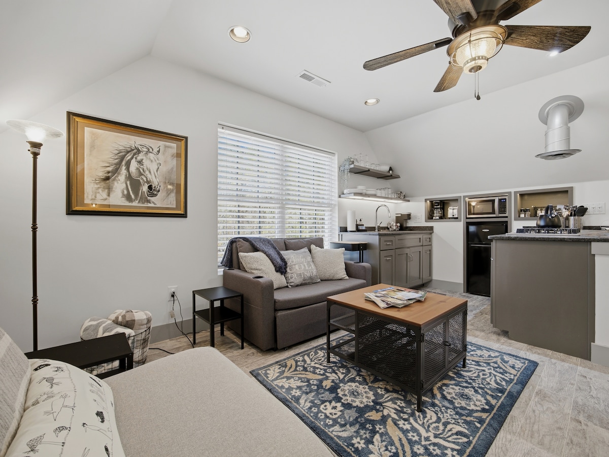 Enjoy the view of rolling green pastures that surround your stay. Hunker down in the evenings around the solo fire pit and get lost in the sounds of nature beneath the pergola on your private patio. Enjoy your own private hot tub while overlooking rolling pastures. We also have other unique rentals on-site that can be utilized for gatherings/parties/events. 3 guests could fit.. the couch is a futon, would be best for kids. ☺️ Well behaved pets are allowed with a pet fee ($35 per pet per day).