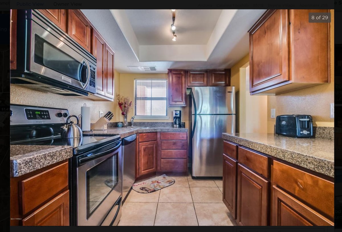 Tá dhá sheomra leapa in aice le Ventana Canyon, urlár na talún gan aonad thuas, Cuntair Eibhear, Wi - Fi, Directv le pacáiste Premier (tá cábla sa phríomhsheomra leapa agus sa seomra suí), paitió príobháideach le gríoscán bbq agus spás páirceála clúdaithe. Le haghaidh tréimhsí fanachta Fadtéarmacha (níos mó ná mí amháin), seol teachtaireacht chugam agus is féidir linn oibriú ar na rátaí! Tá an t - aonad feistithe le: - Córas Osmóis droim ar ais - 4K Smarts TV - Déantóir Caife - Oigheann Tóstail - Cumascóir - Cistin lánstóráilte w/Uirlisí cócaireachta